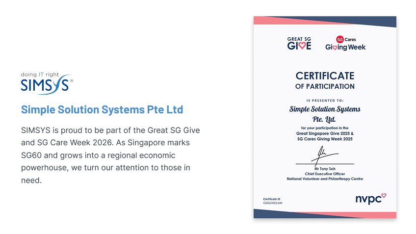 SIMSYS is proud to be part of the Great SG Give and SG Care Week 2026. As Singapore marks SG60 and grows into a regional economic powerhouse, we turn our attention to those in need. See our story at giving.sg